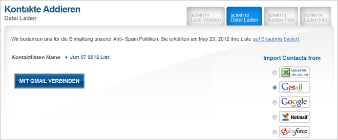 Importieren Sie Ihre Gmail Kontakte in Ihr Benchmark Email Konto mit dieser sicheren Integration. Kontakte behalten die Gruppeneinstellungen, die Sie in Gmail mit Feldern erstellt haben, die Felder können im Vorgang angegeben werden. Sie können Ihr Gmail Konto entweder innerhalb der Listensektion Ihres Dashboards oder durch Ihre Kontoeinstellungen verbinden. Es ist ein schneller, sicherer Vorgang der jederzeit ein- oder ausgeschaltet werden kann.
