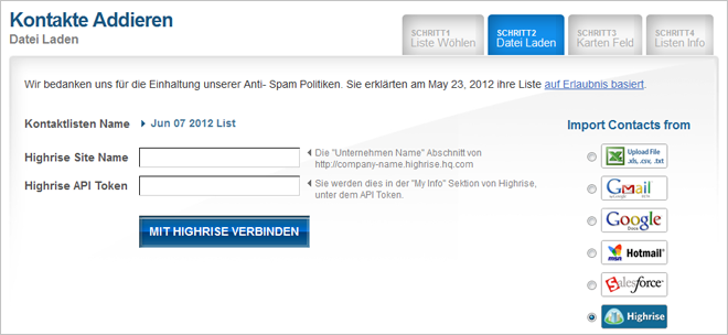 Mit dieser Integration können Sie Ihre Kontakte aus Ihrem Highrise CRM Konto in eine neue oder schon existierende Benchmark Email Liste einfügen. Es ist unglaublich einfach und benötigt keine Installation.