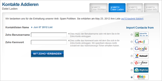 Importieren Sie Ihre Zoho-Kontakte in Ihr Benchmark-Email-Konto und optimieren Sie Ihre E-Mail-Marketingverbindungen. Kontakte werden zu einer E-Mail-Liste Ihrer Wahl hinzigefügt und können einfach in Ihrem Benchmark Dashboard bearbeitet werden. Kostenlos mit jedem Benchmark-Email-Konto erhältlich.
