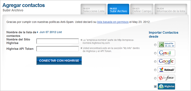 Con esta integración puedes añadir los contactos de tu cuenta de Highrise CRM a una lista de correo electrónico nueva o ya existente dentro de Benchmark Email. Es increíblemente fácil y no requiere instalación.