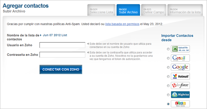 • Más fácil que agregar contactos manualmente de Zoho a tu cuenta de Benchmark Email.