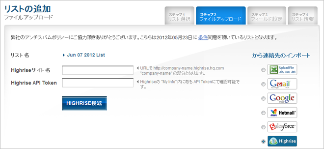 連携することでお客様のHighrise CRMアカウントからの連絡先を新規もしくは既存のBenchmark Emailリスト上に追加することができます。作業は非常に簡単でインストールの必要もありません。