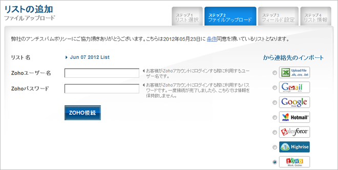 Zoho上にある連絡先をBenchmark Emailアカウントにインポートし、メールマーケティングにご活用下さい。連絡先は選択した顧客リストに追加され、 Benchmark上で簡単にご利用できます。Benchmarkアカウントをお持ちの方は、無料でご利用になれます。
