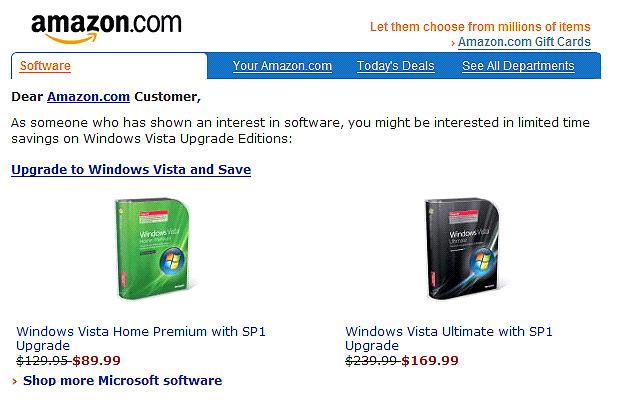 Example: With links in blue including ones that lead to other deals, the individual's account as well as highlighted products, Amazon uses links to show email service providers that each layout is going to someone who is not only a subscriber, but someone who has an account with the company.